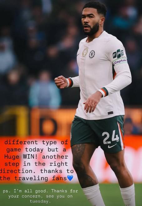 英超第12轮,切尔西客场2-0战胜伯恩利,里斯-詹姆斯打了半场被换下,赛后他在社媒报平安。